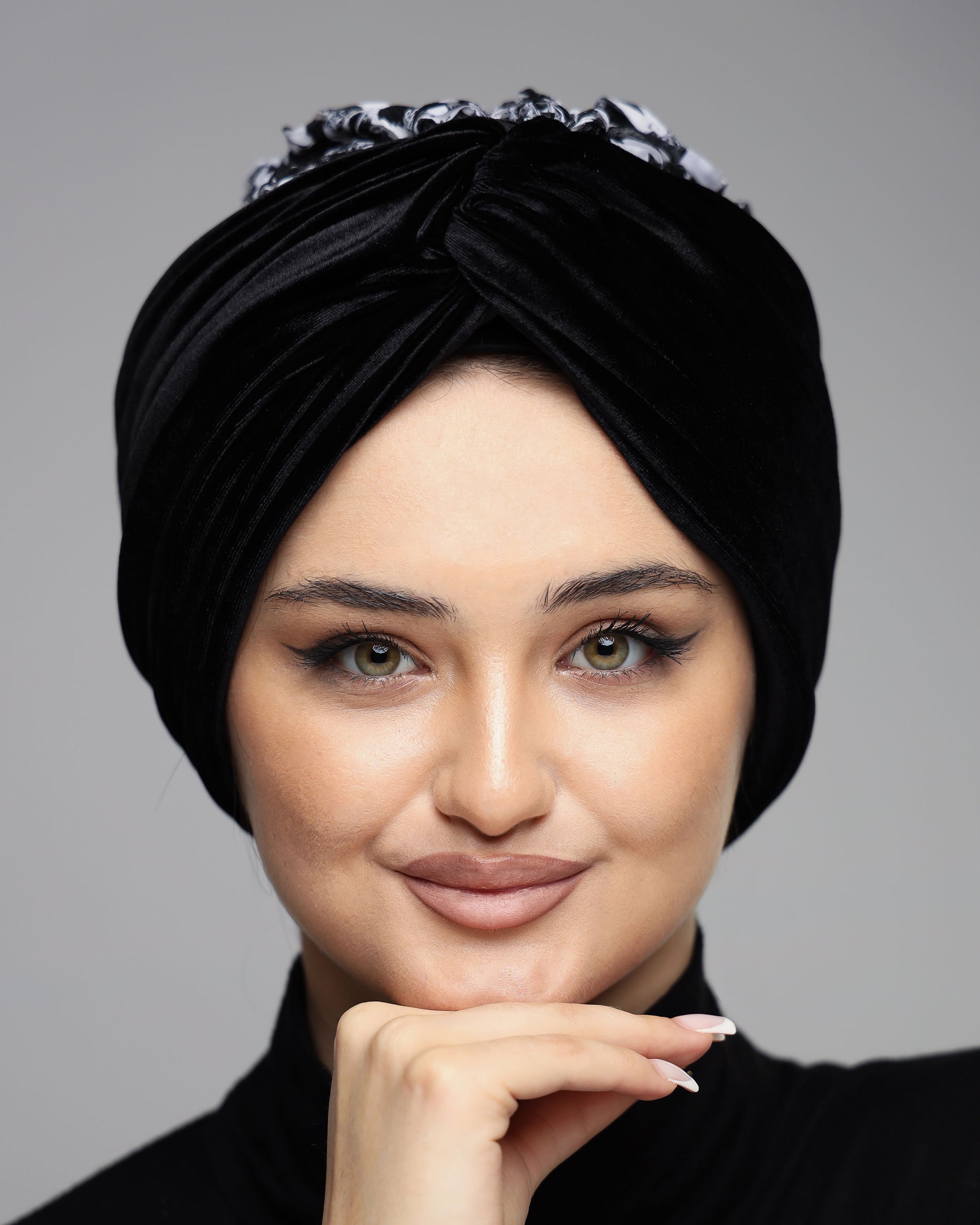 The BW Twisted Velvet Turban is adorned with sequin details in a timeless black and white color scheme, exuding both sophistication and luxury.